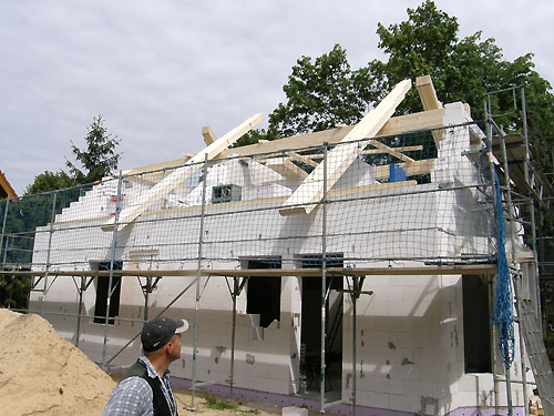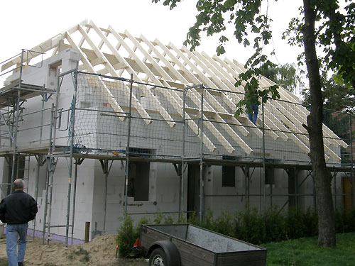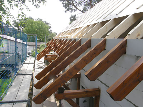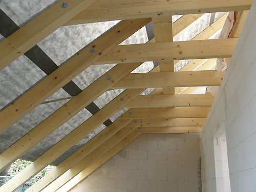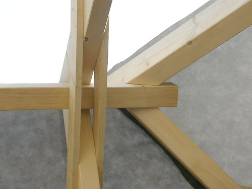 Alle Hölzer bestehen aus Konstruktionsvollholz Fichte. Die Sparrenköpfe sind sichtbar und mit einer Aufdachschalung versehen. Es wurden ca. 10 m³ Holz verbaut und ca. 530 lfm. Holz abgebunden und gerichtet.